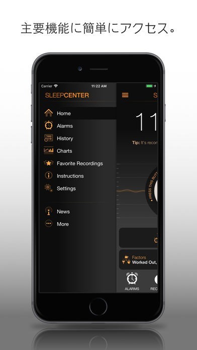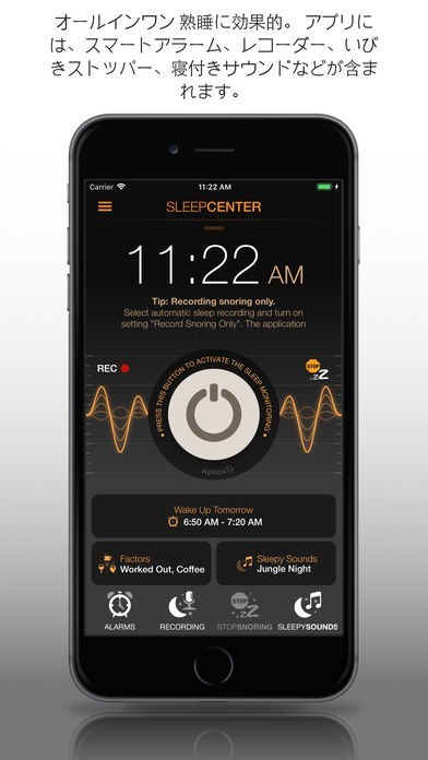 App Storeより引用スリープセンターは、優れたオールインワンアプリです。 4つのモジュールで構成:レコーダー、スマートアラーム、いびき防止、寝付きサウンド