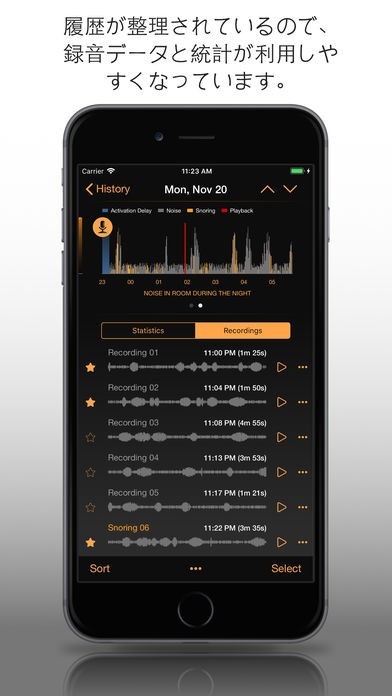 睡眠中の寝言やいびきを録音し(自動または手動の感度レベル、スマートいびき検知を使っていびきのみを録音)、夜間の室内のノイズをグラフ化し、いびきの合計時間を記録することができます。