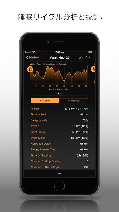 いびき検知は、人工知能を土台に、新しいAppleマシンラーニング技術の力を活用しました。 大量のいびきサンプルを活用することで。正確な統計データといびき検知が実現できます。