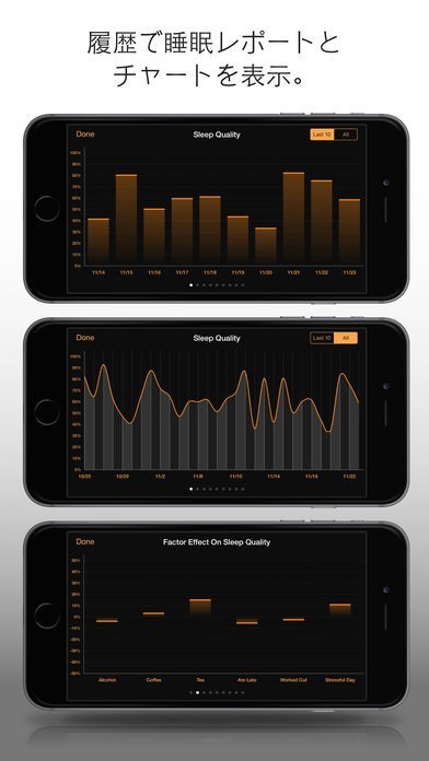 トラッカーデータを使い、独自の要因(活動、眠るための手段、薬、カスタムメモ)を定義することで、どの要因が睡眠に良く作用し、いびきを防止しているかがわかるようになります。 睡眠、夜間のシンプルかつ効率的な分析には美しい統計チャートを自由に活用できます。