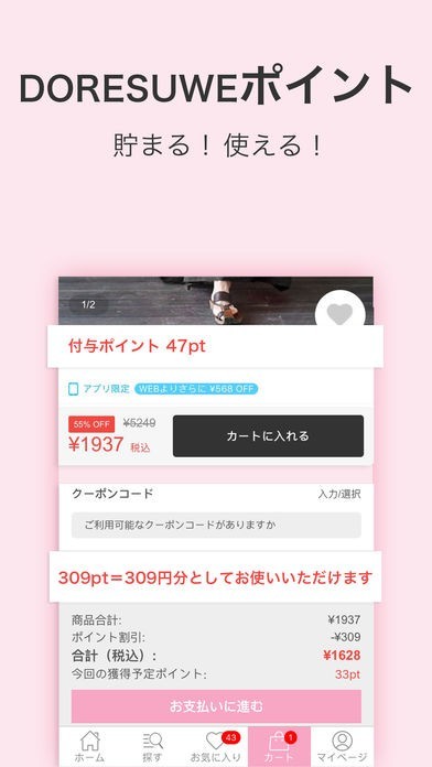 プチプラでオシャレ、可愛くて最新アイテムが揃うと人気の通販サイト、Doresuweの商品をさらにお得にゲットすることができるアプリです。タイムセールや会員限定割引など様々な特典が用意されています。