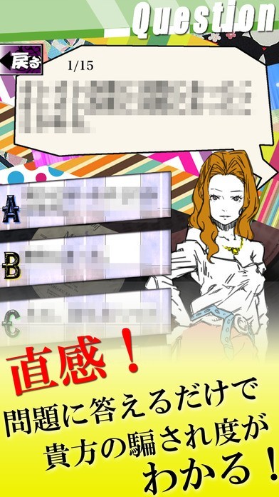 このアプリでは恋愛詐欺に貴方がかかりやすいか、どういった人間性なのかを簡単な問題に答えるだけで