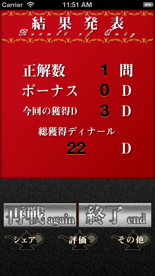魔導士漫画のマギに関係するクイズが300問以上あります。難易度機能があります。初級と中級、上級から選ぶことができます。難易度が分かれておらず、ランダムで出題される全問題もあります。クイズは4択で10問あり正解すると、金貨ディナールをもらうことができます。もらえるポイントは、難易度が高いほど高くなります。10問中8問以上の正解でボーナスポイントが付きます。難易度の高い問題に挑戦し、正解率を高くすることが攻略になります。問題が終わると結果発表があります。正解数や獲得ディナールがわかり、もう一度挑戦することができます。問題は何度でも挑戦できるので、マギに詳しくなり、もっとマギを好きになります。