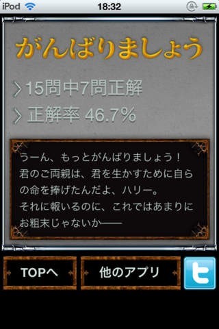 映画化もされ、全世界で人気を博したハリー・ポッターシリーズを専門にしたクイズゲーム「ハリポタクイズ」 シリーズ全作を網羅した問題を300問収録しており、一般的な問題からマニアックな出題までを楽しむことができます。 「全巻から出題」モードと「シリーズを選んで挑戦」モードの2種類を搭載し、好みで選択が可能。 出題に合わせて選択肢の中から答えをタップで選び、全問正解を目指しましょう。 クイズ後には正解率を表示してくれる他、Twitterに向けて結果を呟くこともできます。