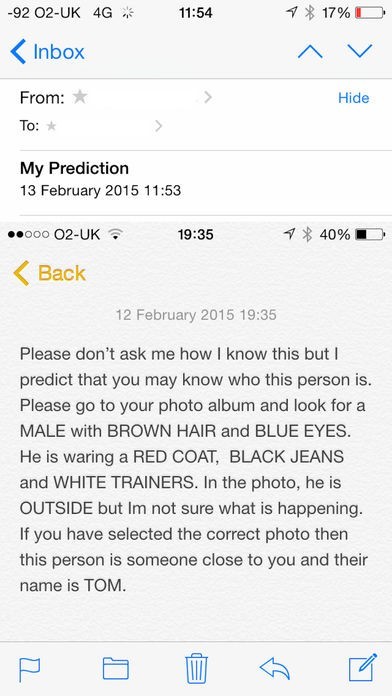 You take a screenshot of a note from your notes app and email it to your client or a friend. The person confirms they have received this email. You ask a participant to open their photos album and to search through their photos until they find someone they care about. You then look at this Photo and point out various characteristics about this person. Their hair colour, their eyes etc... and what they are waring. You then tell them to open the Email you sent them before seeing the freely chosen photo and you have that person described in that email and the kicker finish, their name as well.