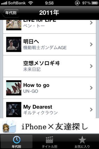 アニソンを聞くのが好きな人は非常に多いです。ただ、アニソンをYouTubeで検索する時に「あの曲知ってるんだけど、何ていうタイトルだっけ?」となることが多いと思います。そんな時にこのアプリを使えば、お目当てのアニソンに行き着く時間が短縮できます。検索は、タイトル、放送年別などにまとまっているので探しやすいです。また、自分の生年月日を入力すると、当時の年齢に合わせて 曲検索できるのも秀逸!YouTubeから流れてくる動画はクオリティが高いので、「視覚」からも楽しめるのも嬉しいポイントです。気に入った曲は、そのままお気に入り登録して、プレイリストにしてしまいましょう。