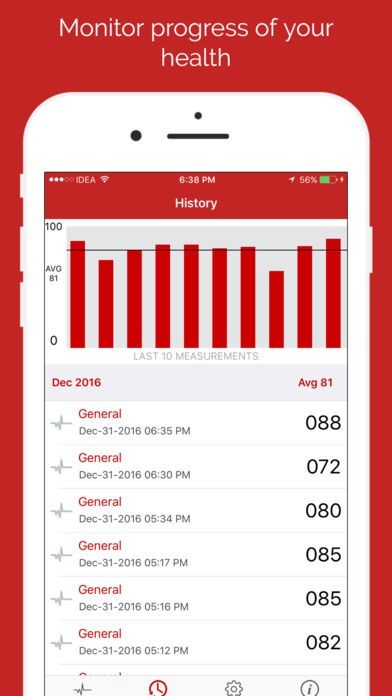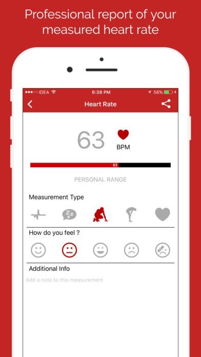 あなたの心拍数を簡単に測定するためのクリーンで直感的なデザイン。結果とともにグラフでライブパルス測定データを提供します。