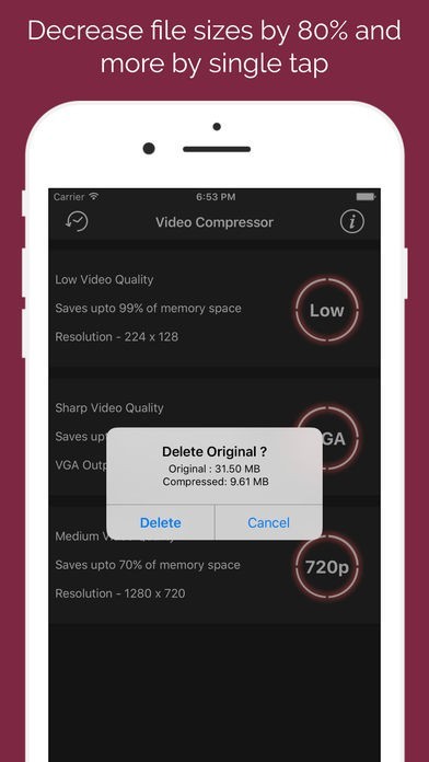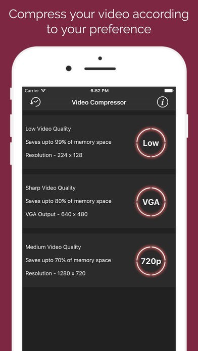 このアプリでビデオを圧縮するのは本当に簡単なプロセスです。あなたの写真ライブラリからあなたのビデオを選び、それをサイズ変更して最終的なビデオをより小さなサイズにし、メモリスペースを節約しましょう。