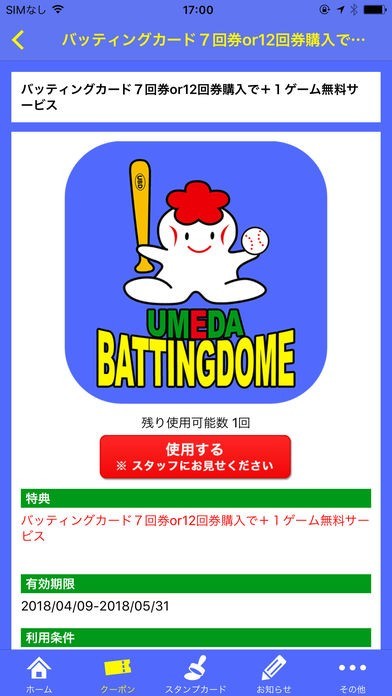 梅田バッティングドームの公式アプリでは、プッシュ通知による最新のお知らせ配信など、お得な情報をいち早くゲットできます。