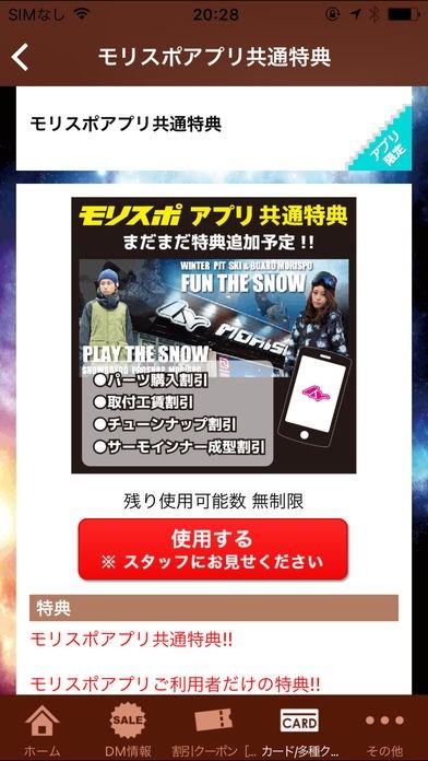 スキーやスノーボードなどのウィンタースポーツ専門店モリスポの公式アプリとなっていて、スマートフォンでお得なキャンペーン情報やイベント情報などをチェックできます。