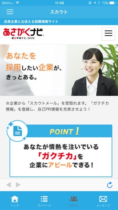 就活ニュースペーパーが掲載されており、就活をする際に役立つ一般常識や就活のいろはが載っています。またアプリにはスカウト機能もあるので、自己PRを入力しておくと便利です。