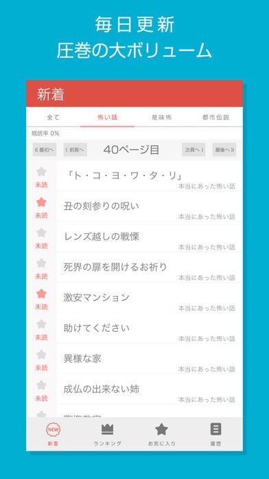 本当にあった怖い話、意味が分かると怖い話(意味怖)、都市伝説など、一度読んだら抜け出せない最凶のアプリです。