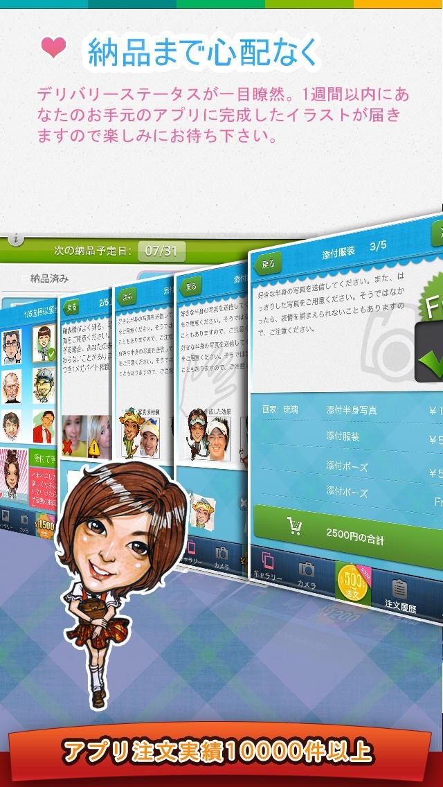 注文のステータスが一目でわかる仕組みに。1週間以内に必ずあなたのお手元のアプリに完成したイラストが届きます。