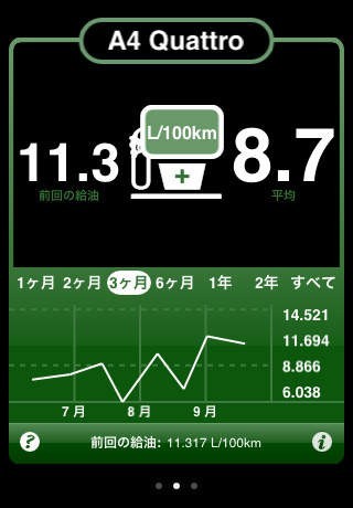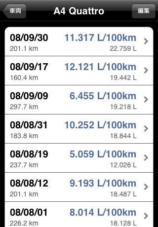 App Storeより引用AccuFuel™ 燃料効率トラッカーは、自動車の燃料効率を簡単に楽しくモニターする、強力なツールです。スポーツカーの燃費は悪いものでしょうか?燃費のよさが謳われているハイブリッド車は果たして経費節約につながっているでしょうか? AccuFuel™ を使えば、運転の習慣や癖がどのように燃料効率に影響しているか、すぐに判ります。ガソリン価格の高騰のためハイパーマイル(燃費を向上させる運転)を実践しているなら、AccuFuel™ でハイパーマイルの効果のほどが測れます。複数の自動車もトラッキング可能。画面にタッチするだけで情報を表示できます。燃費を マイル/ガロン (米国)、マイル/ガロン (英国)、リットル/100km、または km/リットルで表示!さらに、積算距離計とリセット可能な距離計のいずれも使用が可能。詳細とスクリーンショットのサンプルは、Appigo のウェブサイトをご覧ください。
