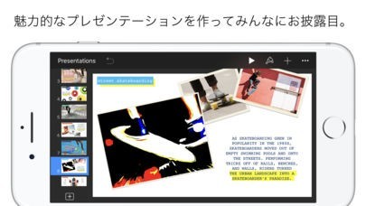 Keynoteは、スマホ一つで本格的なプレゼンテーションが作れるアプリです。デザインパターンはどれもおしゃれで種類も豊富、初心者でも気軽に使えます。好きな写真や動画、イラストの挿入はもちろん、豊富なテンプレートを自由に使って、自分だけのオリジナリティあふれるプレゼンテーションが簡単に出来上がります。初心者向けにおしゃれなテンプレートも豊富に取り揃えられており、初めての方でもスマホ一つで簡単に操作可能。また、iCloud上で他のデバイスと簡単にプレゼンテーションを共有することもできます。AirDrop機能も付いており、作品を気軽に共有できるのも良いです。