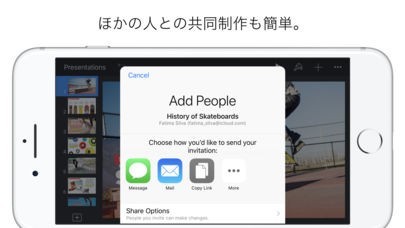 商品の説明や企画の売り込みにも便利な「Keynote」は、使いやすい機能を備えたプレゼンテーション用アプリです。 プレゼンテーション作成機能はタップ数回で写真や画像、アニメーションの追加が可能。地味になりがちなテキストを華やかに彩ってスライドショーが作成できます。 共同制作機能を利用すれば、複数人数によるリアルタイムでの制作が行えるのもこのアプリならではの便利なポイントです。 さらにクラウドストレージサービス「iCloud」との連携し、手軽にデータ保存ができるのも特徴となっています。