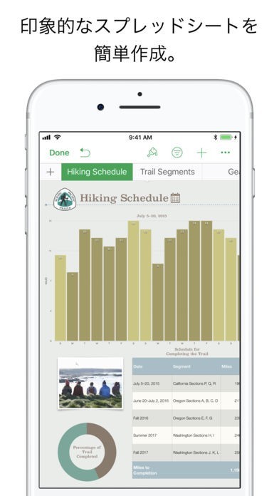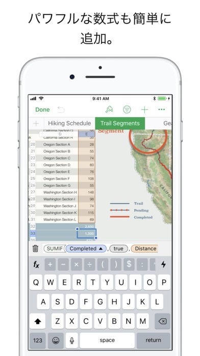 「Numbers」はスマートフォンなどのモバイル端末で利用するために設計された表計算アプリとなので、タップやドラッグなどで利用しやすいインターフェイスとなっています。30以上の豊富なテンプレートに加えて、250種類以上の関数を使用することが可能となっているのでビジネスからプライベートまで幅広い用途に使用することができます。共同制作機能を使用することで複数のユーザーでファイルを共有しながら作成することが出来るほか、他のユーザーのカーソルを閲覧することが可能となっているのでどこを編集したかもわかりやすく、多人数でのプロジェクトの進行にも役立ちます。
