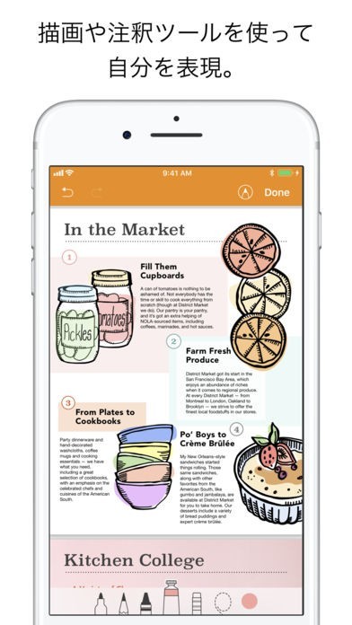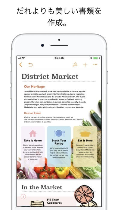 Pagesは、iPhoneで見栄えの良い文書を作成したいと思った時に選択肢に挙がるアプリです。使い勝手の良さの理由は、あらかじめ用意されている60種類以上にも及ぶテンプレートの数々です。学校に提出するレポートや履歴書など目的に応じたテンプレートが用意されているため作業がはかどります。作成した文書は、相手を選択して共有することが可能です。また、フォントにこだわったり、図形を取り入れることでより美しく文書作成が行えます。