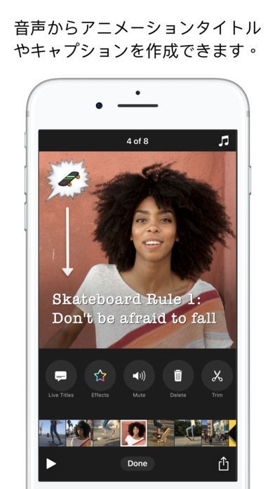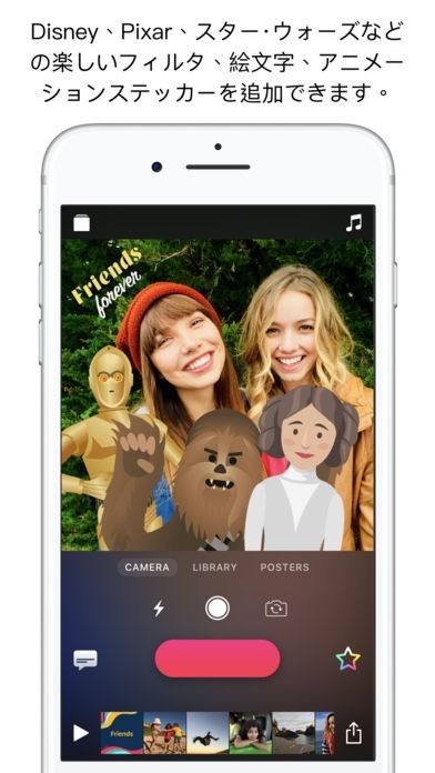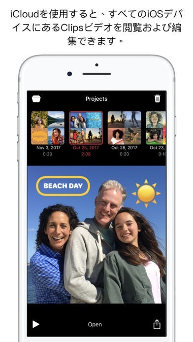 『Clips』は、面白い動画を制作してそれを共有し楽しむことのできる動画編集ツールです。 複雑な編集ツールを使わず、直感的な作業で簡単に動画編集を行いビデオを完成させられるのが魅力となっています。 家族や友人に送って楽しめるような、ビデオメッセージの作成も可能。操作が簡単なだけでなく、音楽、絵文字、キャラクターのステッカーなど、ビデオメッセージに入れることのできるオプションは多種多彩で、ミニストーリを作るようなこともできます。