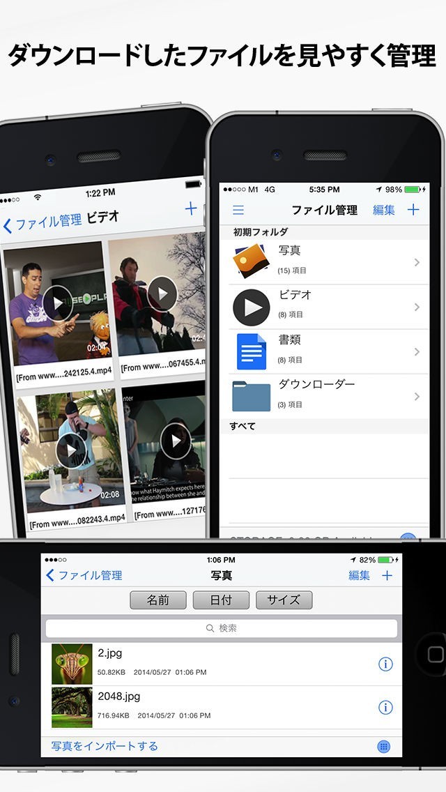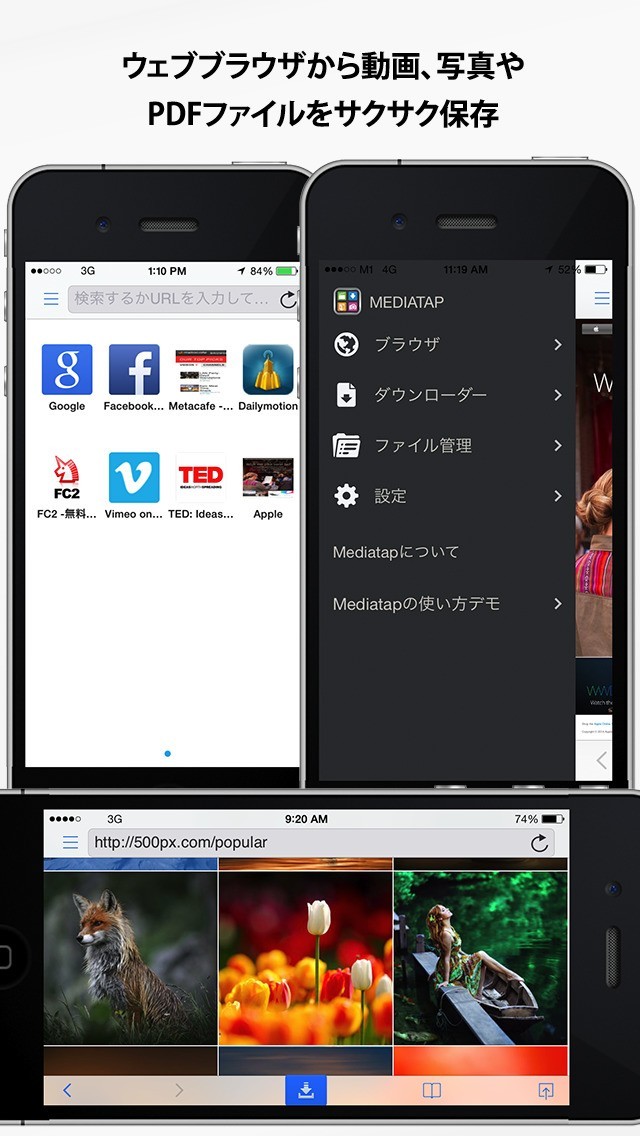 「Mediatap」は様々なファイル形式に対応しているダウンローダーアプリです。URLや検索からページを表示、タップするだけでページ上にある写真や動画をダウンロードすることができます。複数のファイルも一括で高速ダウンロード!ファイルを管理することもできるので、資料集めとしてもオススメ、学生や会社員に最適です。また、ファイル機能で見やすく整理が可能、新規フォルダーをタップで作成、ジャンルごとに分けられます。整理オプションをつかえば日付やサイズ順にも並び替えることが可能です。タブやお気に入りといった基本的な機能を備えているのでブラウザとしても優秀、ネットサーフィンをしながらファイルを探してダウンロードできます。
