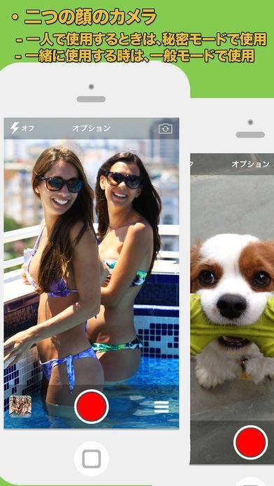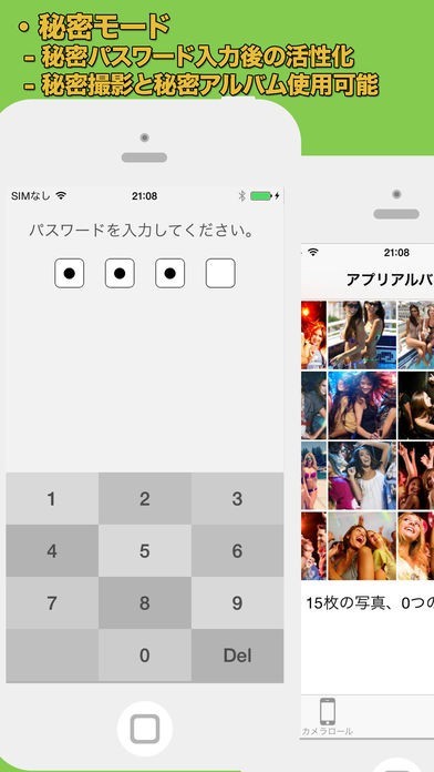 一緒モードアルバムと秘密モードアルバムそれぞれに別々のパスコードを設定してアルバム内を保護してプライベートを守ることができます。無音録画に対応しているので秘密で撮影した動画もコッソリ管理することが可能です。