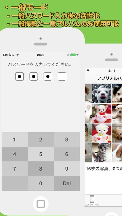 秘密モードと一般モードの二種類があり、パスコードロックによってモードを簡単に切り替えることが出来ます。データフォルダや撮影モードも簡単に使い分けられるので便利です。