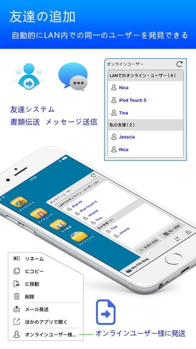 2. 自動的に別のLAN内でのオンライン・ユーザーを発見し、友達に追加後、いつでも、どこでも該当する友達と書類、メッセージをやり取りできる。