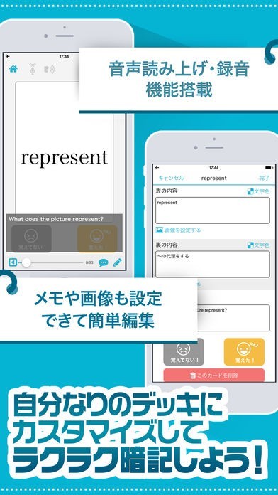自分の苦手な単語だけを集めてカードデッキを作ることが出来ます。学習の際には自動的にフラッシュカードをめくる機能も付いているので、忙しい時にはハンズフリーで覚える事も出来ます!