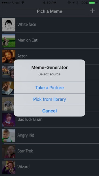 App Storeより引用Meme Generator is a Universal App.you can create your funny meme images from your own pictures or from the ones suggested on the Home screen (you can add all images you want in there). Ten, after setting the top and bottom texts over your selected picture you can share them by Mail, SMS or by the social network apps installed on your device, like Facebook, Twitter, Google +, WhatsApp, etc.