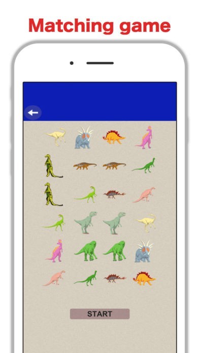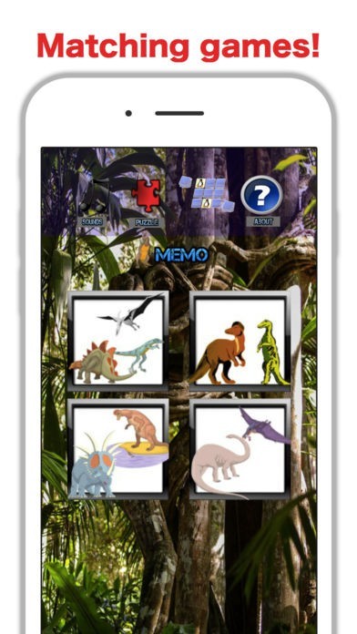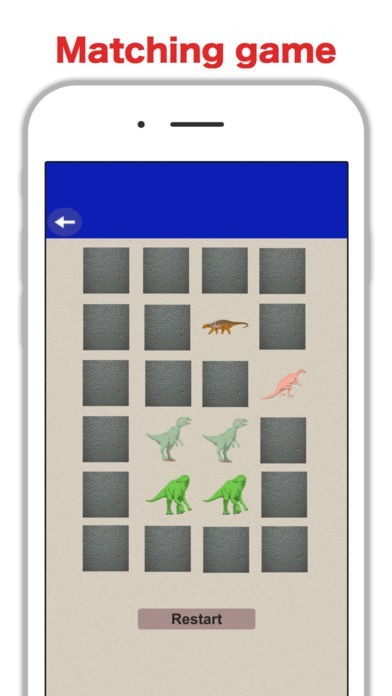 マッチングゲームは、札をめくって同じ恐竜のイラストを二つそろえる、いわゆる神経衰弱です。場所を覚えておかないと何度も同じところをめくってしまうので、自然と記憶力が鍛えられます。