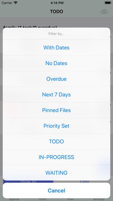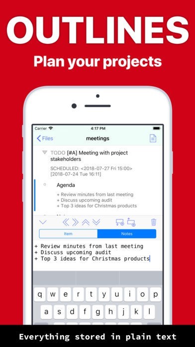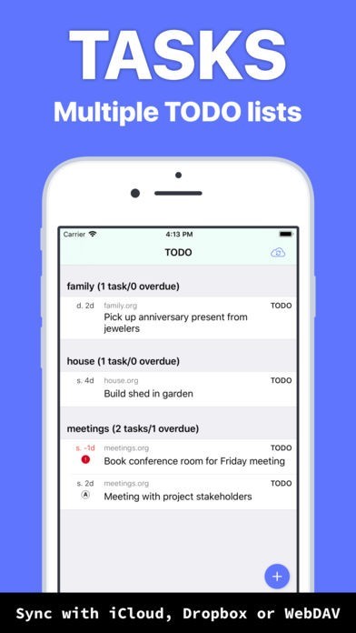 + KEEP IN SYNC: Sync your org files using iCloud, Dropbox or WebDAV. WebDAV is supported by services as OpenDrive, Nextcloud and ownCloud.