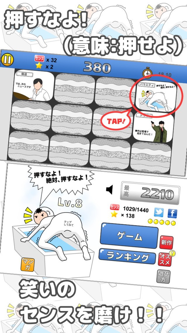 「押すなよ!絶対、押すなよ!」はバラエティ番組で用いられる「押せ」という前振りを利用した、楽しいタップゲームです。 ゲームを始めると、12個のテレビ画面が表示されます。そのどこかに、バラエティ番組(熱湯風呂の上にお尻を突き出した放送)が表示されるので、出来るだけ早くタップしてください。タップした速さに応じて、右上の制限時間にボーナス時間が加算されて、長くプレイする事が出来る様になります。 終盤になるほど「映画」や「報道」といった別番組も表示される様になります。別番組をタップしてしまうとお手つきとなり、制限時間がマイナスになります。 スコアに応じて星が貰えて、星を使用すれば、「タイム+15秒」や「チャンネル1/2」というアイテムが使えるので、更に高得点を目指せます。