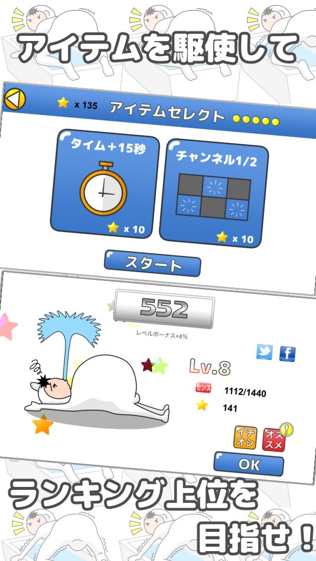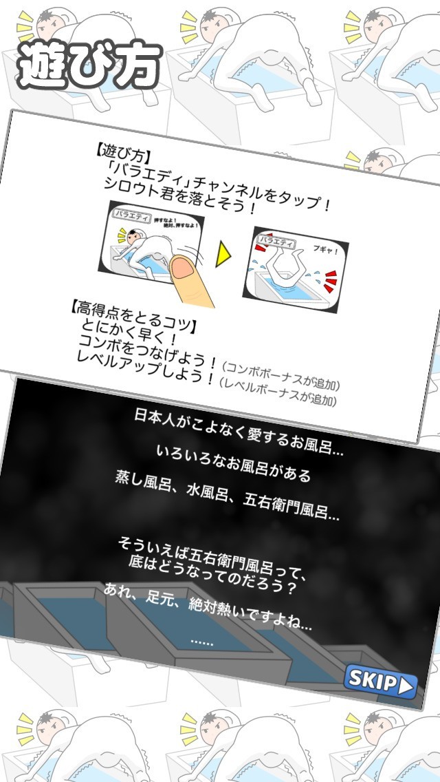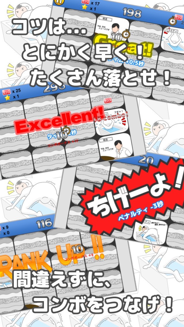 「押すなよ!絶対、押すなよ!」は、フリの効いたフレーズに対して適切にお風呂に突き落としていくゲームです。テレビの内容を把握してとっさに対応する瞬発力が求められます。見ているだけで笑いを誘うようなイラストが目白押しなので、パーティーや合コンなどで場を盛り上げる際に使えます。間違えずに連続でタップすることでスコアを伸ばすことができます。攻略のコツとしては、残り時間を延ばしたり、出現する画面の数を減らすことができるアイテムを駆使することがあげられます。プレイをしているうちにレベルを上げることができるので、こつこつ遊ぶゲームが好きだという方にも向いています。