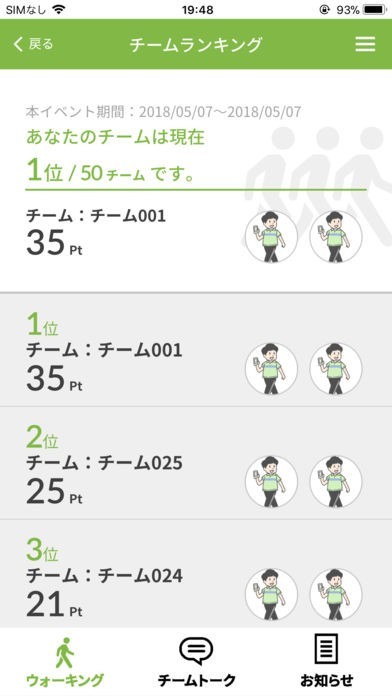 イベント中は獲得したポイントがアプリに記録されます。それを元に獲得ポイントランキングが作成されます。見事1位になったチームには豪華商品が送られますからウォーキングに熱が入ります。