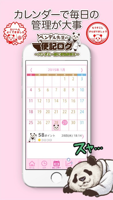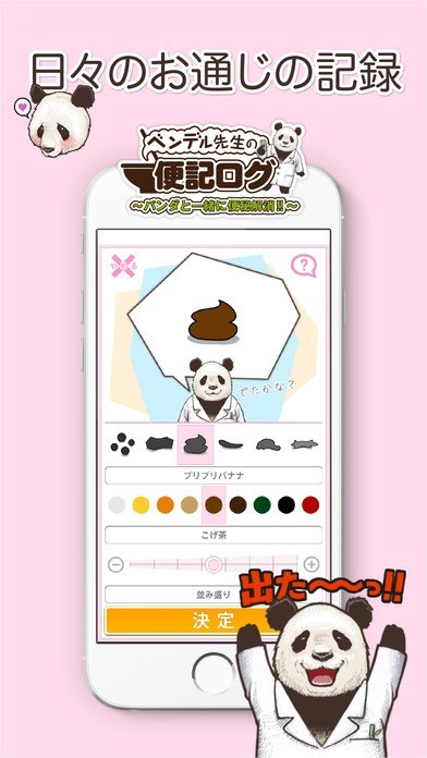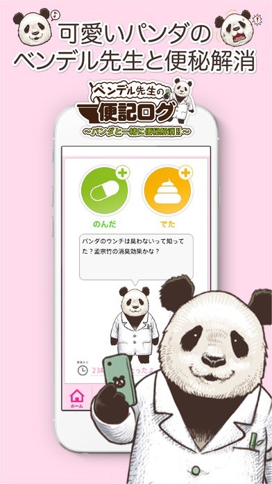 便記ログは、薬やサプリメントの飲用記録と、日々の排便記録に特化した完全無料アプリ。日々の便の記録に対して、便秘研究が仕事のインテリパンダ、ベンデル先生の愉快な表情とともに便秘解消に関するアドバイスやコメントが表示され、毎日楽しみながら簡単に記録をしていくことが出来ます。