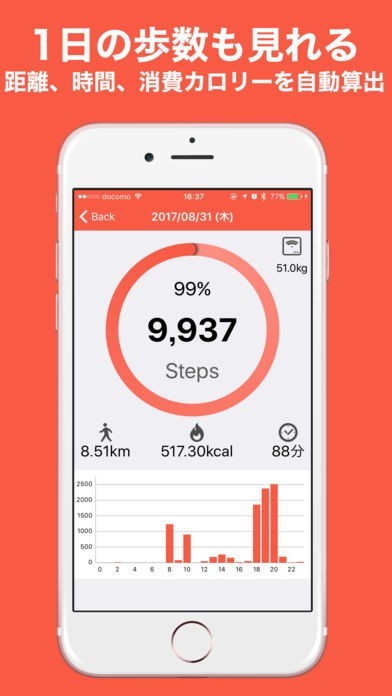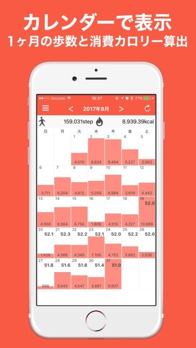 ・歩数を元に歩いた距離、消費カロリー、歩いた時間を自動計算