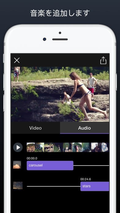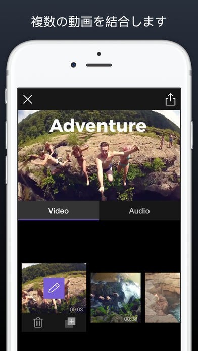 このアプリでは一つ一つの動画の編集はもちろんのこと、複数の動画を結合させて1つの動画にすることも可能です。またそういうときに便利なのが動画に好みの音楽を追加する機能です。これを使えば動画を結合したときに気になる音の違和感を解消することができます。