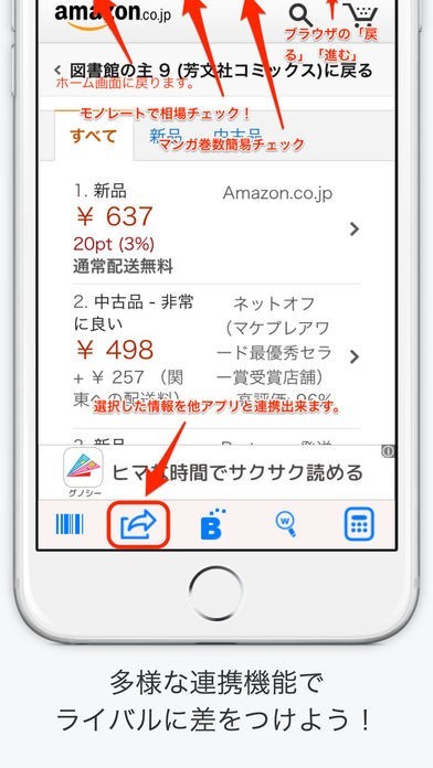 せどりの為の画期的なAMAZON価格リサーチアプリです。自分の売りたい商品が今いくらで売れているのか、出品者数はどのくらいいるのか、購入した人は何人いるのかなどを知ることが出来ます。値段の推移や売れ行き具合を月ごとにグラフで表示できるからその商品の人気や売れ行きが分かります。調べたい商品のバーコードをカメラで読み取る事で瞬時に検索可能、アマゾンのサイトからキーワードやコードをコピーして、アプリに貼り付ける事でも検索できます。ブルートゥース対応の無線バーコードリーダー、appleWatchにも対応、多様なアプリとの連携が可能です。