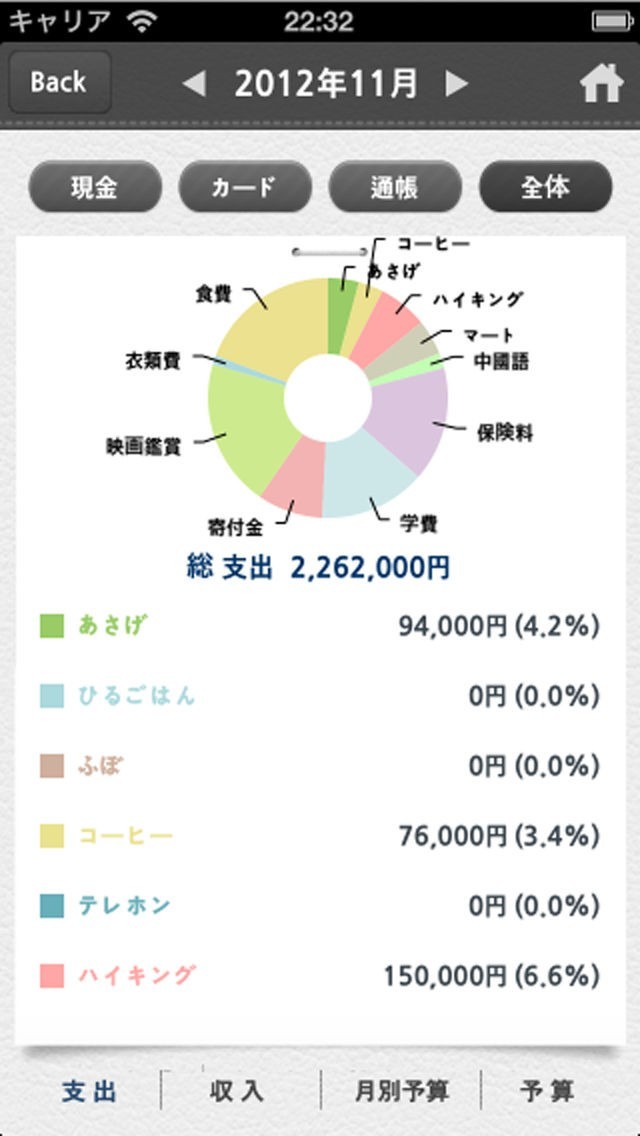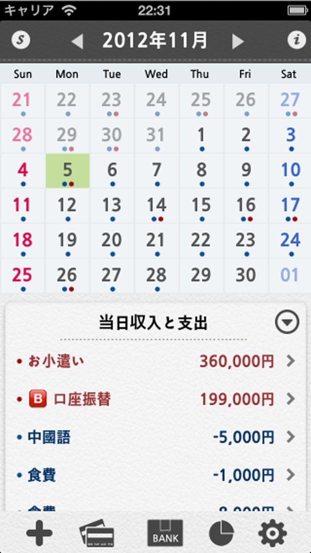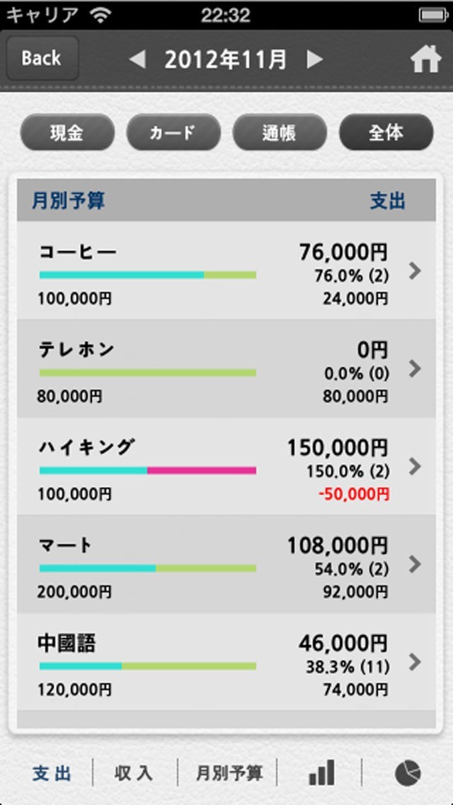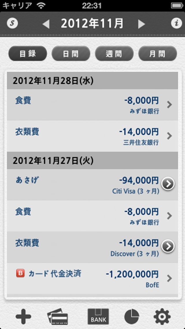 現金の支出状況を自由に入力出来るようなっています。カードの利用履歴を表示させる事が可能で、日本円以外の通貨に切り替えられるのも特徴です。分割払いのシミュレーションも簡単に行えますよ。