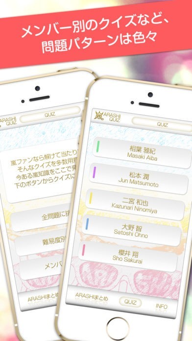 * メンバー専用モードがあり、レギュラー番組を多く持つ相葉雅紀やキャスターもやっている櫻井翔、リーダーの大野智や、俳優業で活躍している二宮和也などの個別クイズも出ます。
