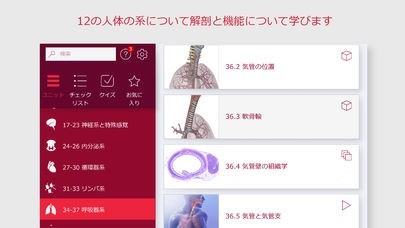 気管の繊毛がどのように動くのかということは詳細な図を見るまでは具体的に頭で理解することは難しいでしょう。アプリという特性を活かし全身の組織についてイラストによる解説が楽しめる点が優れています。