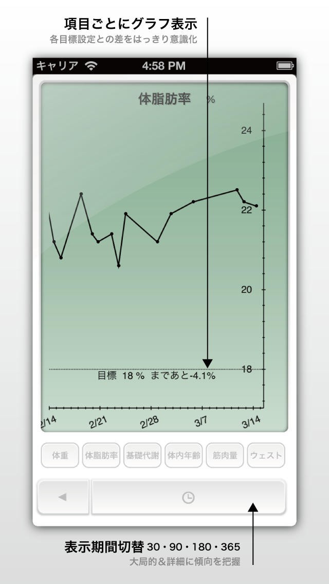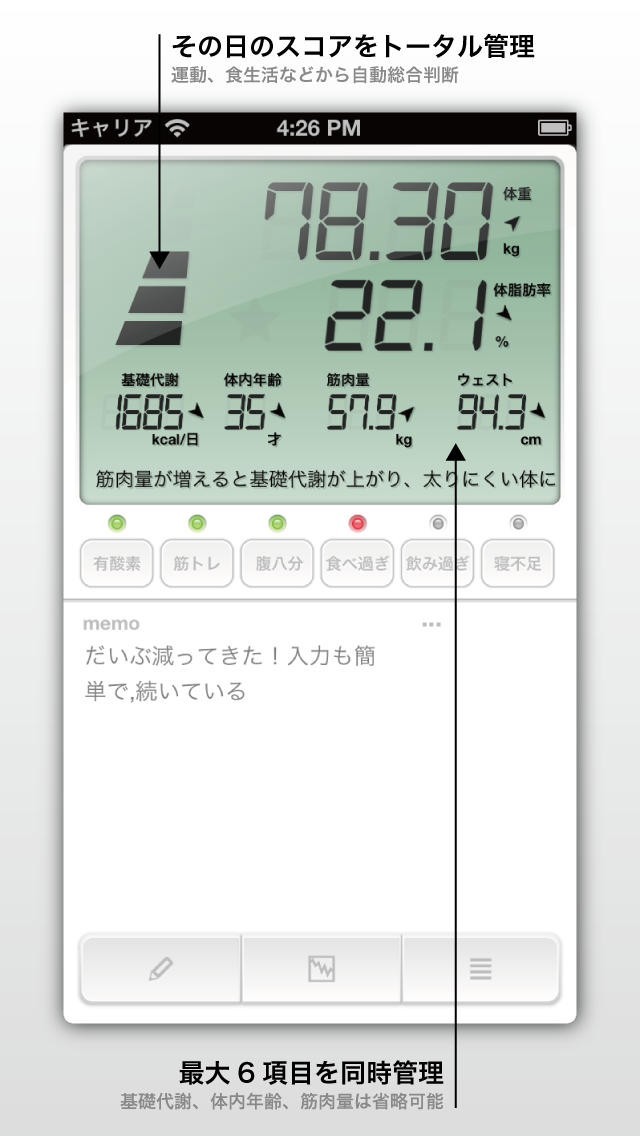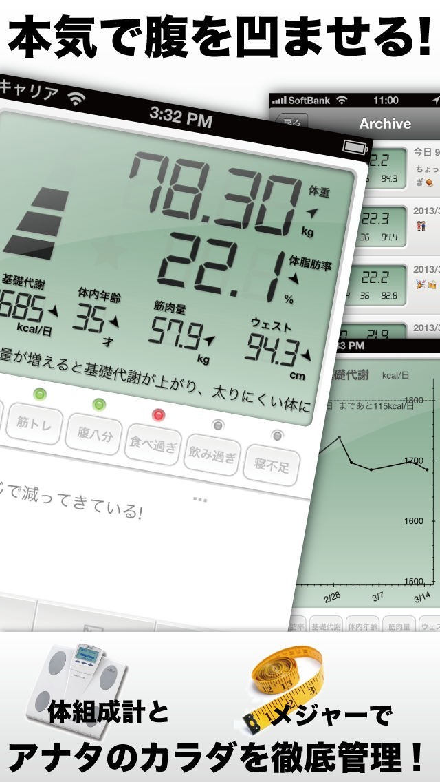 体重や基礎代謝量の測定に対応している「BestShape〜本気でダイエット!」は生活習慣を可視化して健康的にダイエットを行っていける医療系アプリで、グラフや数値で細かくデータを確認出来る特徴があります。パスワード設定が行えるので他人に見られる心配もありませんし、ウエストや筋肉量等の各項目に合わせて記録していけるのが機能のメリットでしょう。スコアデータをまとめて表示出来るようになっています。また体内年齢を測定出来るのも1つの利点です。