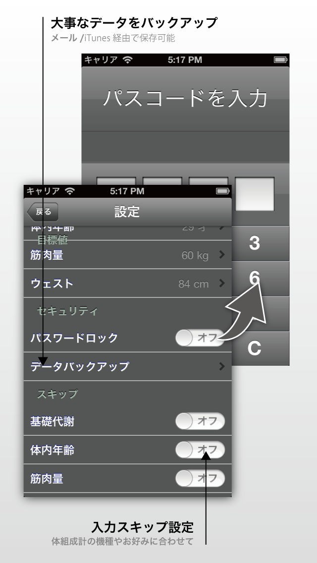 パスコード設定に対応!体重や減量データを安全に管理出来る