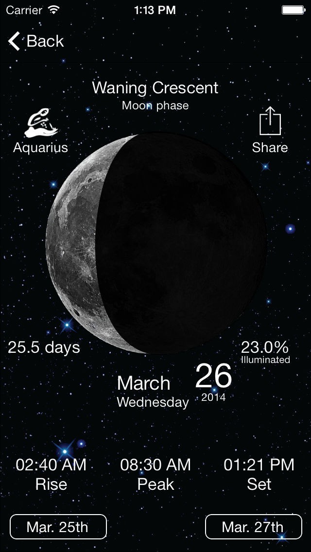 もし月の観測をするのであれば、アプリで見える月の時間帯や面積比率が分かります。また、星の観察をする場合、月の光がネックですが、アプリで月が出ていない時間帯が分かるため、予定を立てるときに使えます。