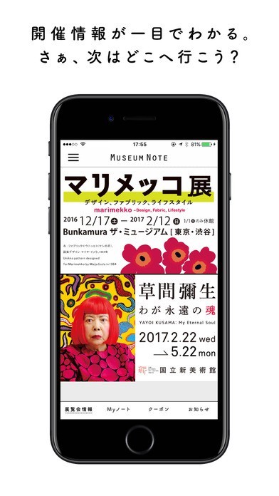 そんな新しい体験と、便利でシンプルな開催情報、お得なクーポンがひとつのアプリになりました。美術展から博覧会、キャラクター展まで、展覧会ファンのためのアプリです。