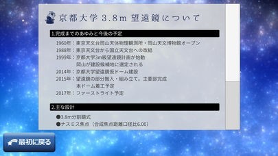 京都大学が建設している、東南アジア最大の3.8m望遠鏡の建設までのプロセスが詳しくわかるアプリです。最新情報が更新されるのでいち早く望遠鏡についての情報を手に入れることができます。