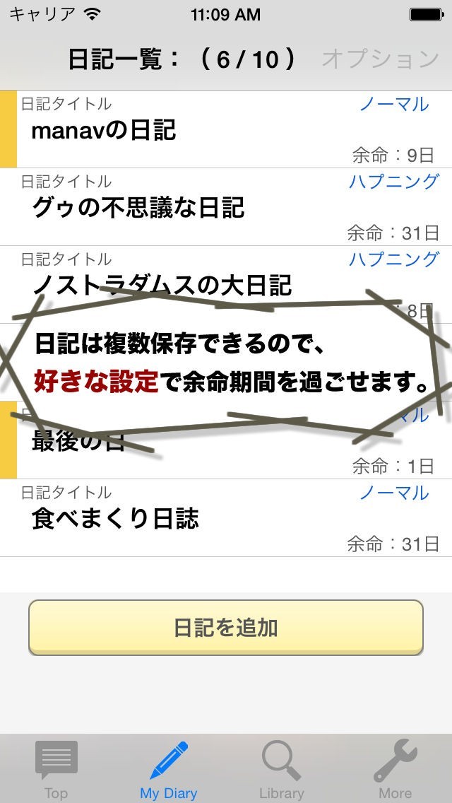 最初に1〜31日の間で余命期間を設定して「余命日記」を作成し、その期間に何をするかを考えるアプリです。