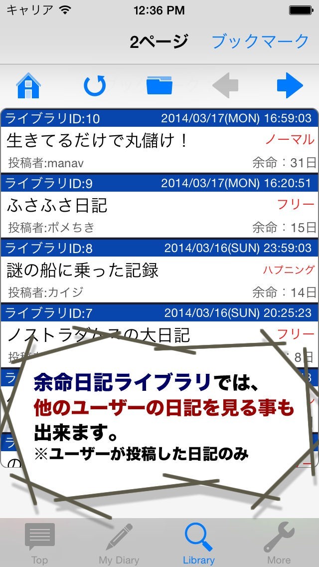 ユーザーが投稿した「余命日記」を閲覧できる「余命日記ライブラリ」もありますので、他の人はどんな行動をするのかも参考にしてください。