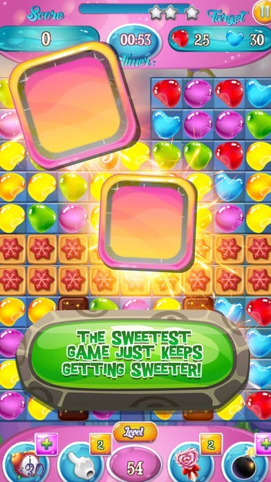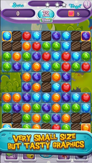 Match and collect candies in this amazingly delicious puzzle adventure guaranteed to satisfy your sweet tooth! Blast 4 candies to get horizontal or vertical strip, used to destroy all game objects on its way. Blast 5 candies to get candy package bonus, used to destroy all game objects around (9 items) on its way. Blast 6 candies to get multicolour bomb, used to destroy all item the same color which has been combined.