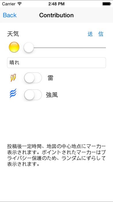 今いる場所の天候のチェックができるだけでなく自分がいない場所の天候をチェックできるようになっているので気になる場所があった時にそこの天候がどうなっているか確認できて良いです。
